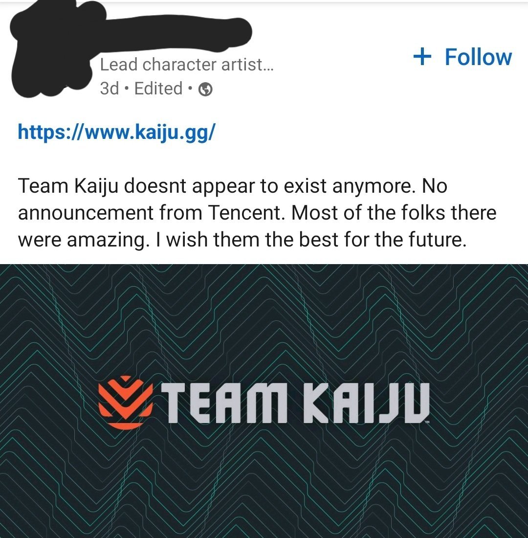 一開始,有前工作室員工在領英上爆料了工作室已經關閉的傳聞,隨後推特用戶“Kurakasis”證實了Team Kaiju的官網kaiju.gg無法打開的事實。而Kurakasis還透露,在北美地區的Team Kaiju關閉後,騰訊在歐洲申請了“Team Jade”的商標,尚不清楚這兩者之間是否存在關聯。