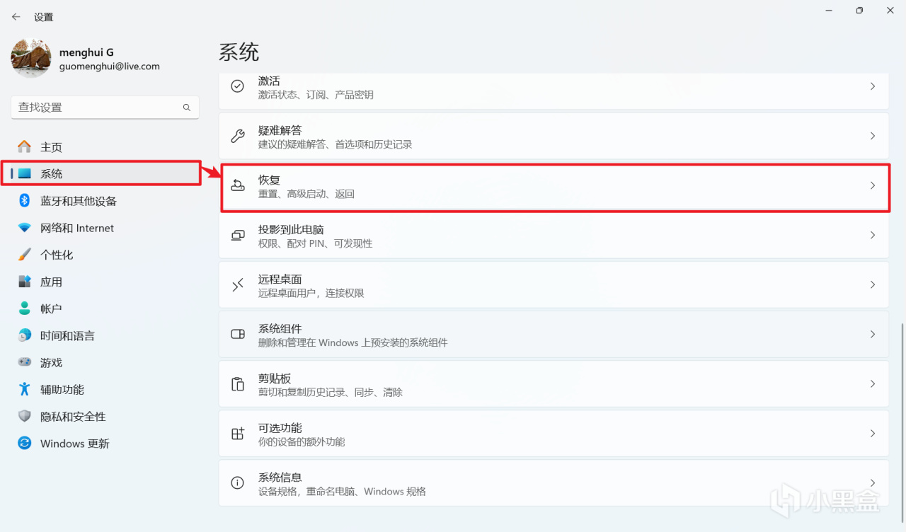 在设置界面选择恢复选项。