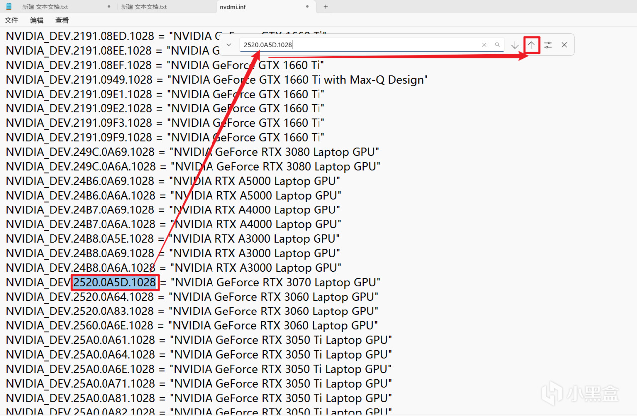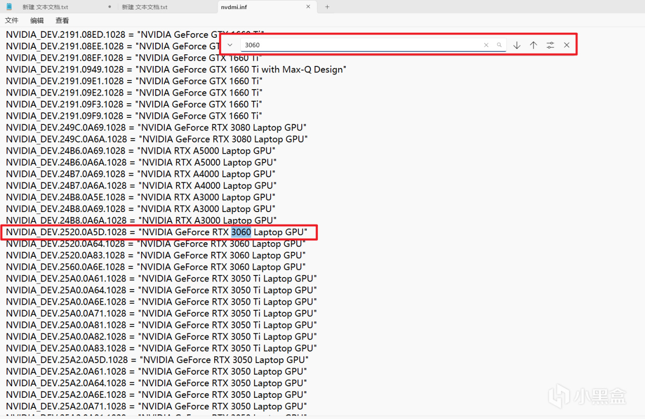 在桌面上打开这个文件,搜索比如3060 3050 等条目,目的是找到该安装文件中有的信息,找到一条好做替换,只要是和你平台硬件贴近的都可以,没有硬性要求必须是哪个条目。