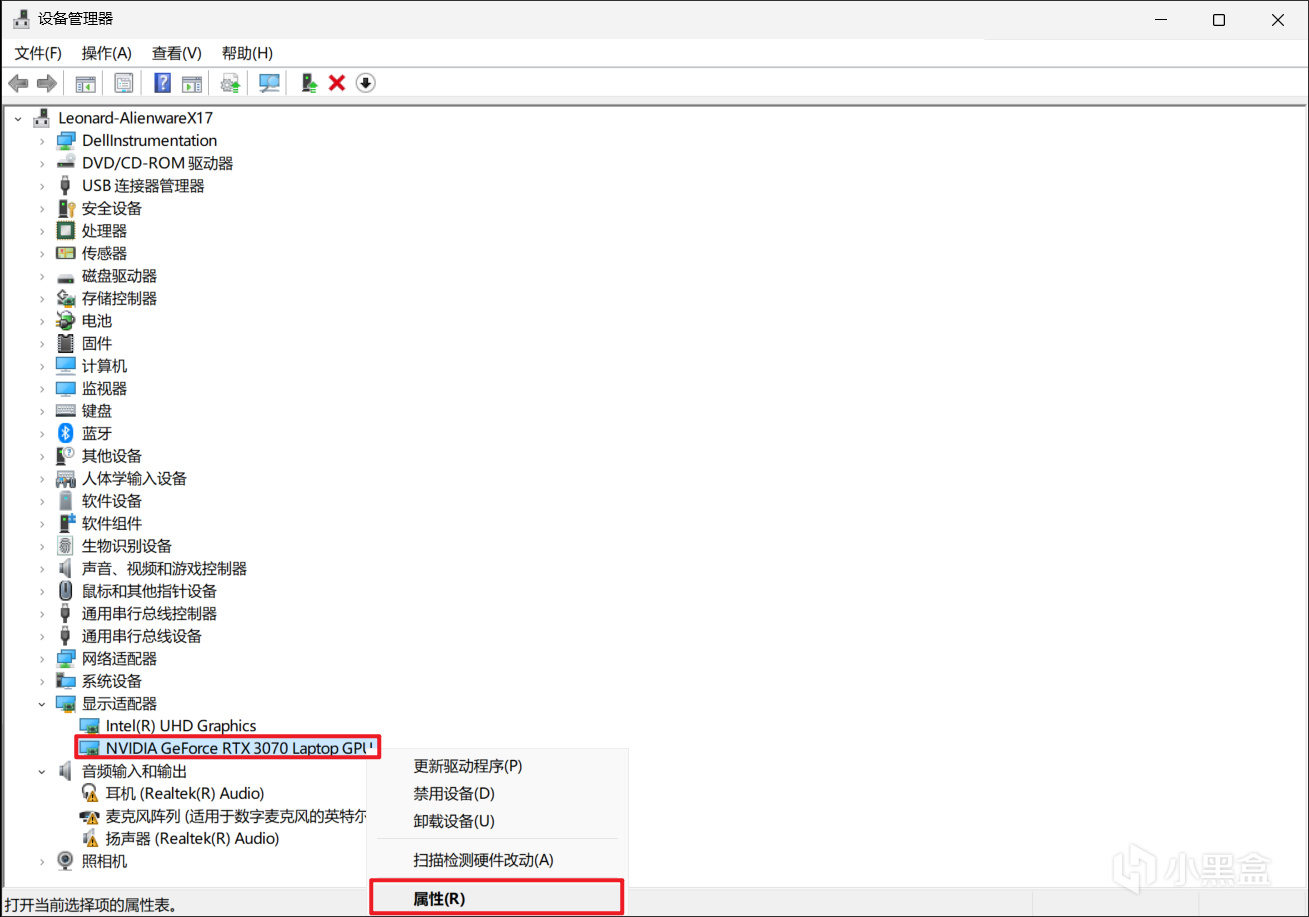 设备管理器中,找到显示适配器,找到自己的显卡,右键点击属性。