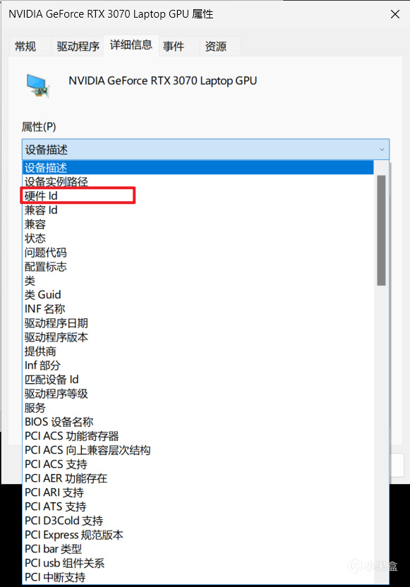 打开属性面板后,在属性一栏下拉菜单,找到硬件ID一栏选择。