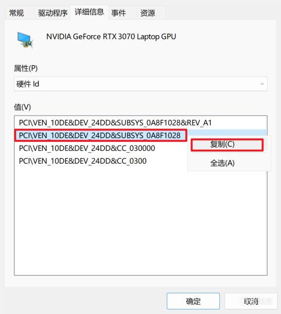 查看显示出来的硬件ID,并且将第二行右键复制,保存到桌面记事本上备用。