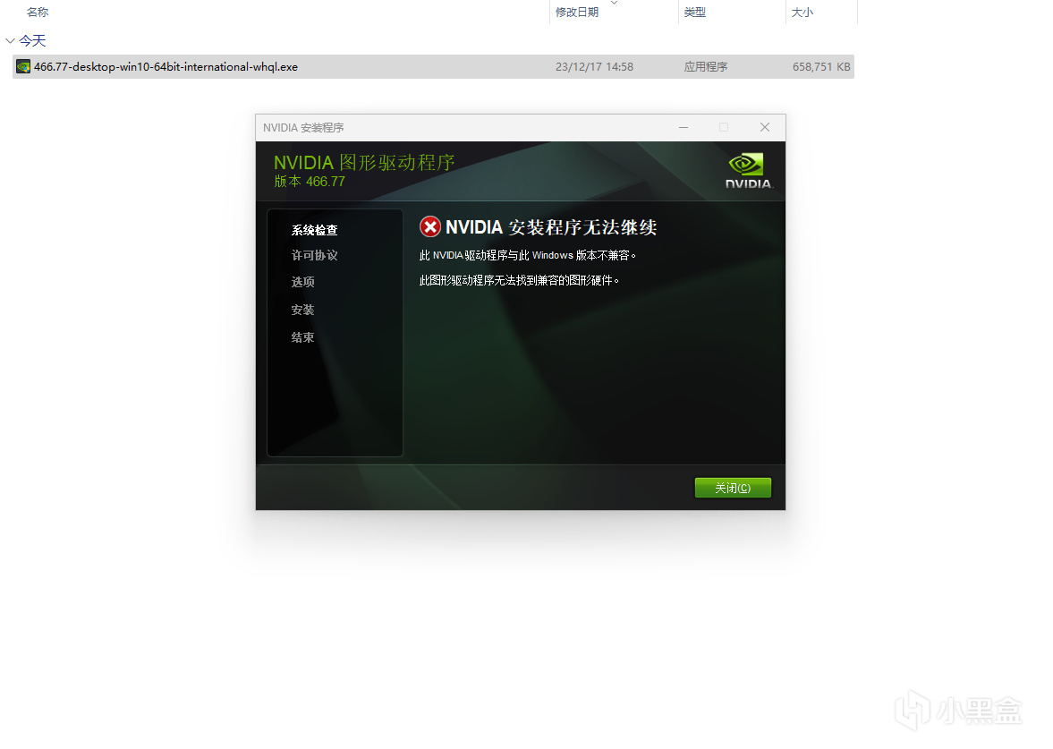 发现出现兼容问题,不慌,到这一步别关掉窗口,此时驱动程序的安装文件已经解压到C盘了,我们把C盘的安装程序复制到别的地方搞事情(其实直接把驱动程序后缀改成压缩包也可以)。