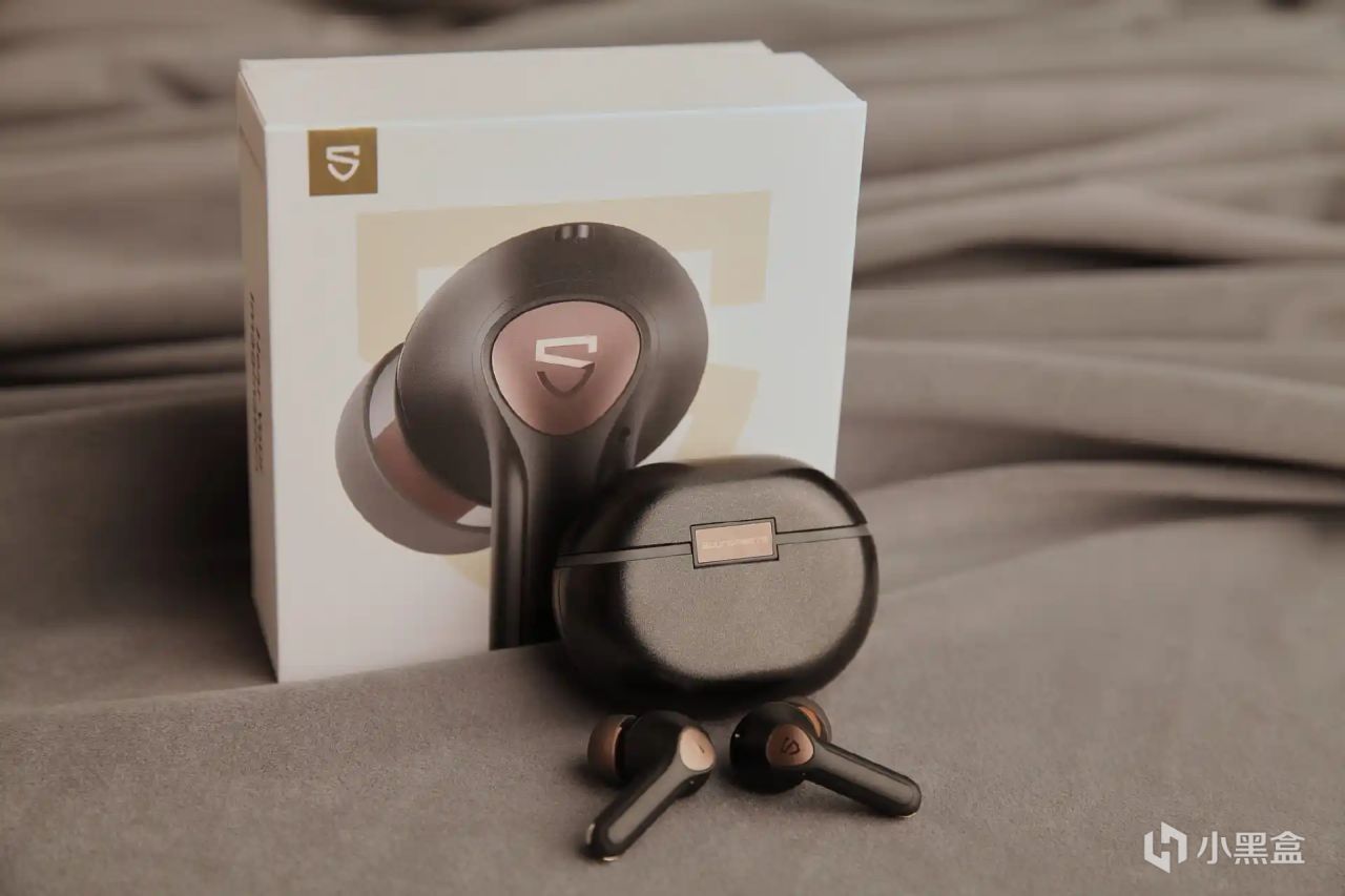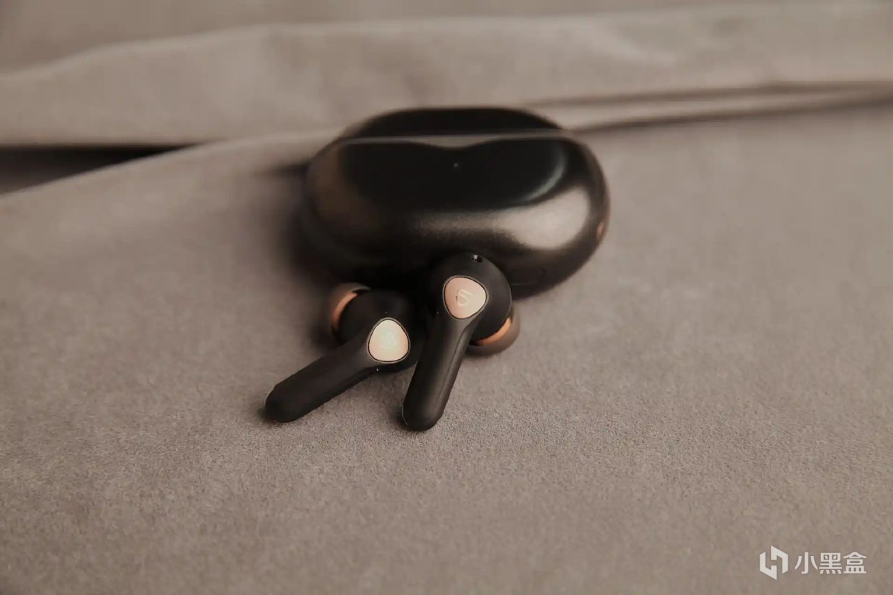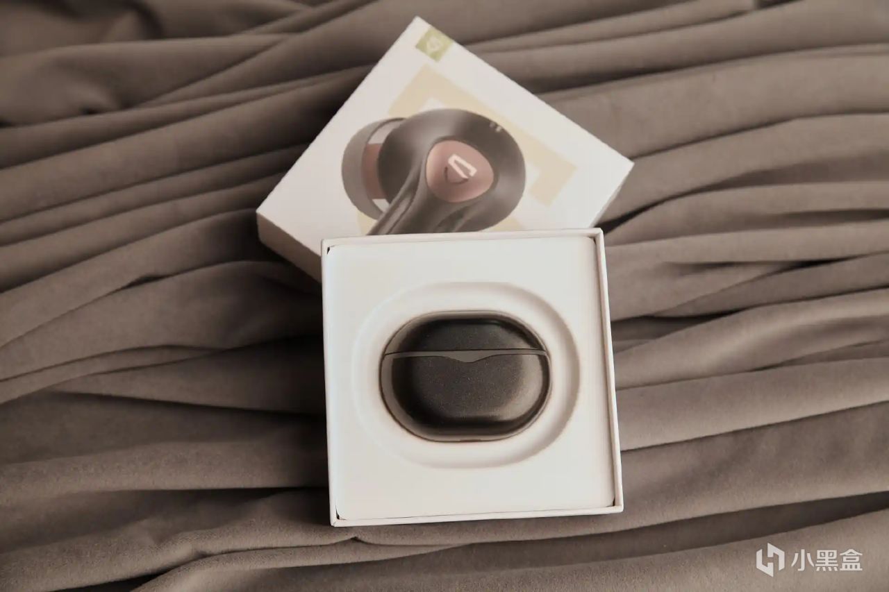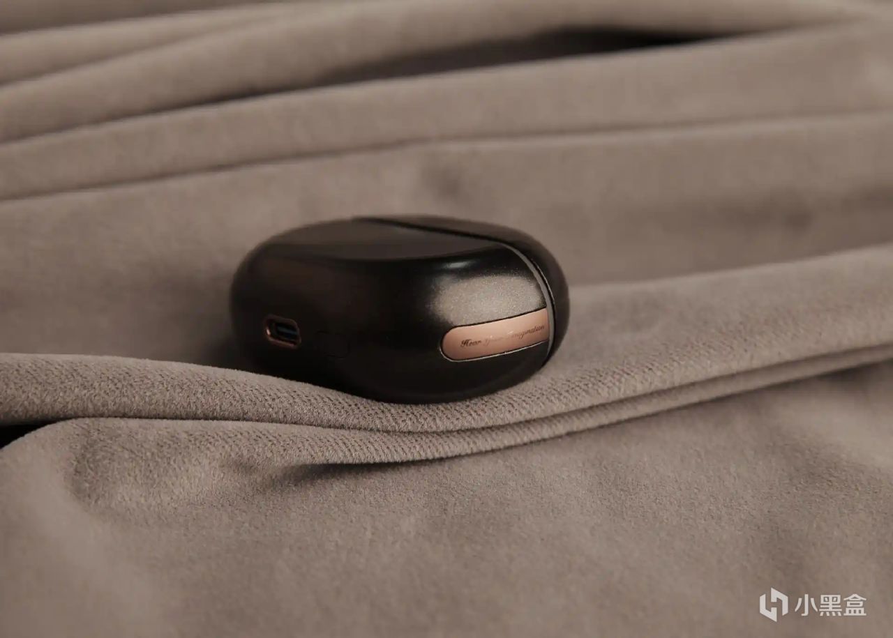 充电仓的也采用了圆润的鹅卵石造型,体积不大,单手的握持感很舒服,也方便我们收纳和携带。在充电仓部分还加入SoundPEATS 金色铭牌点缀,很有设计感。充电仓开盖的阻尼也控制挺好,开闭都很顺滑,方便取放耳机。