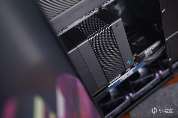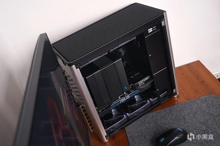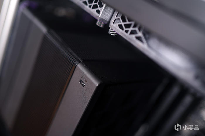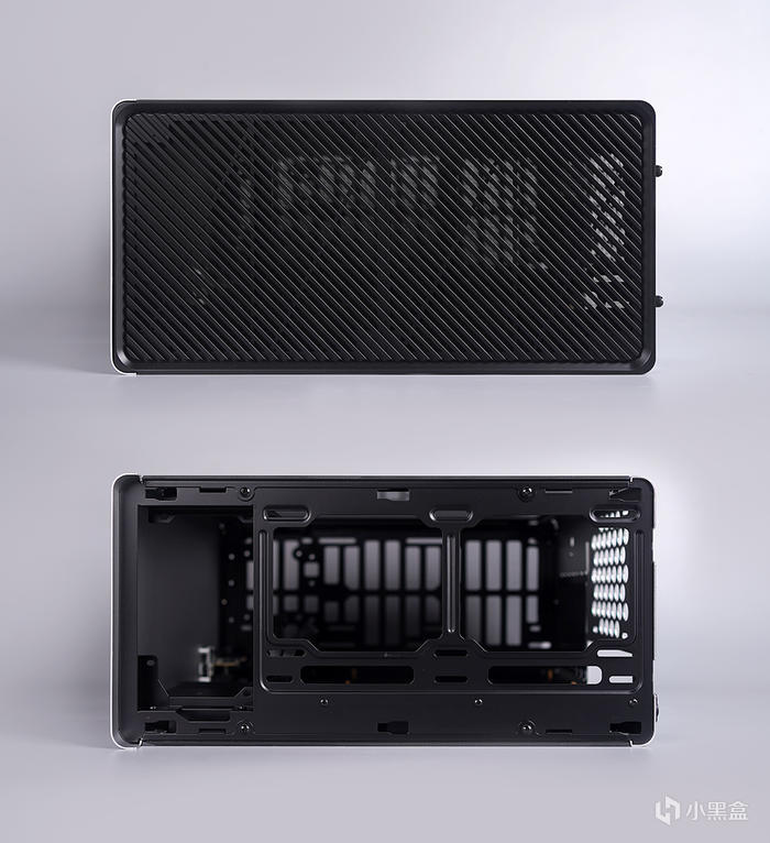 機箱頂部,斜條紋樣式的格柵通風面板,面板內置有防塵網,裏頭電源前置安裝位,風扇支架可支持安裝 120/140×2 風扇,可支持安裝 240 冷排規格。側板採用榫卯方式固定,通過頂部的螺絲鎖定。