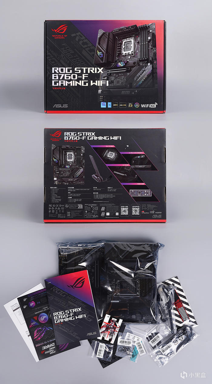 華碩 ROG STRIX B760-F GAMING WIFI 主板,降低門檻的敗家之眼 ROG STRIX 系列,價位相比親民一些,定位電競遊戲玩家,包裝正面搭配主板本體展示,燙印的型號示意,左上角 ROG LOGO ,左下角 ASUS LOGO,一旁則是一堆的圖案標識,13th CORE、B760、DDR5、LGA 1700、PCIe 5.0、AURA SYNC、WiFi 6E;給到的附件比較的豐富, ROG 信仰貼紙、說明書、ROG入會卡片、鑰匙扣、WIFI 天線、M.2 螺絲卡扣及墊片、SATA 數據線、裝機紮帶、散熱貼等。