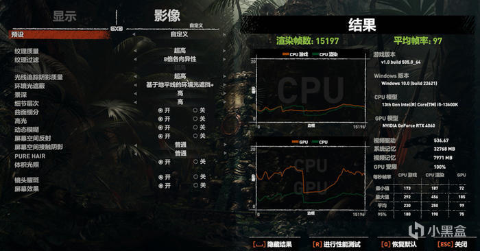 古墓麗影—暗影在1080P 分辨率,開啓 DLSS 最高光線追蹤下測試平均 97FPS 。