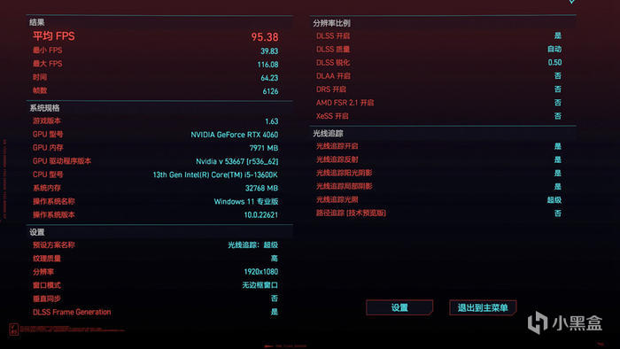 2077 在 1080P 分辨率,超級光線追蹤特效下,開啓幀生成 DLSS3 測試平均 95.38FPS 。