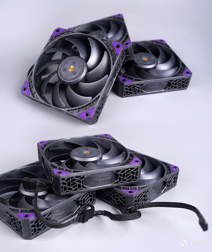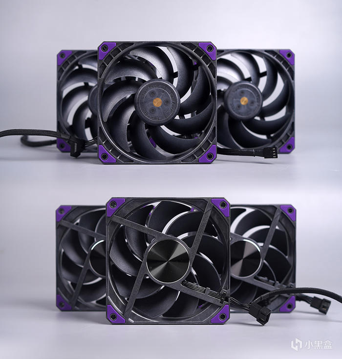 風扇的本體,通體採用了同級別風扇常見的 LCP 液晶聚合物,有着非常不錯質感。採用 30mm 厚度,9 片大扇葉設計,具備有更高的風量與風壓。背面軸承座四條固定加強筋樣式,正反面都各有四個紫色的減震膠墊,可有效降噪和減振,軸心給到同心圓不鏽鋼高光倒邊的貼標修飾。