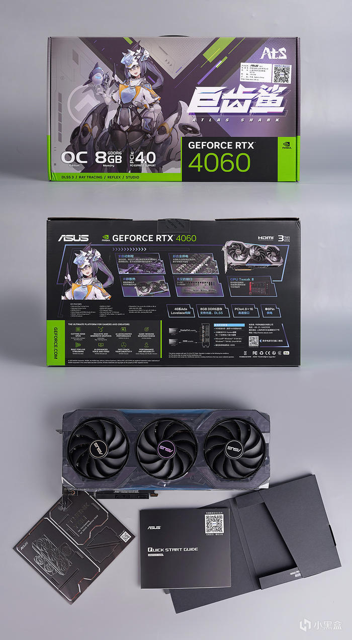 華碩 ATS 巨齒鯊 GEFORCE RTX 4060 O8G GAMING,包裝正面帶有專屬的二次元形象—鯊魚姬圖案,下沿爲 NV 的 RTX 型號圖標、標註 OC(超頻版本)、8GB 顯存、支持 PCIe 4.0 。包裝背面,圖文展示產品賣點、規格、特性及配置要求等信息。裏頭附件一個手工裝飾牌,一份快速安裝指南。