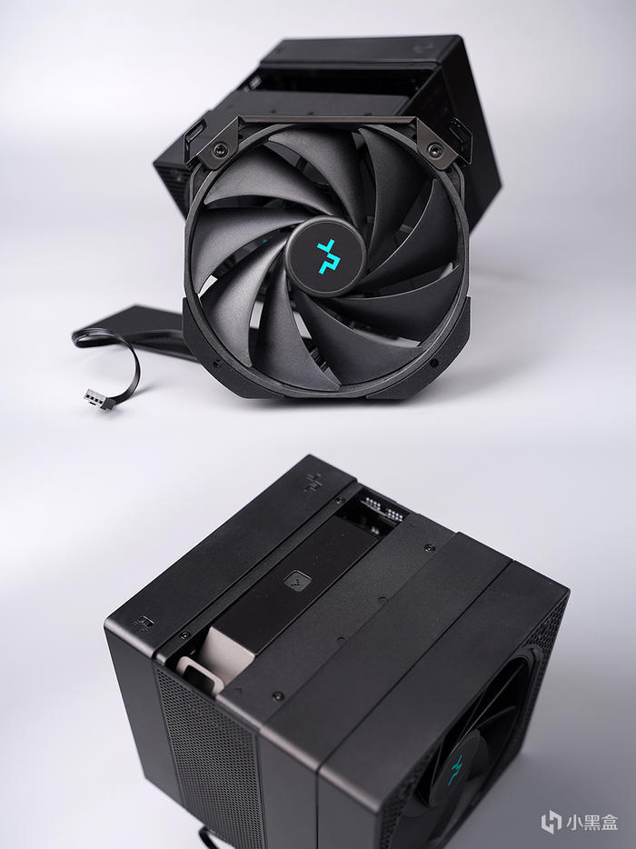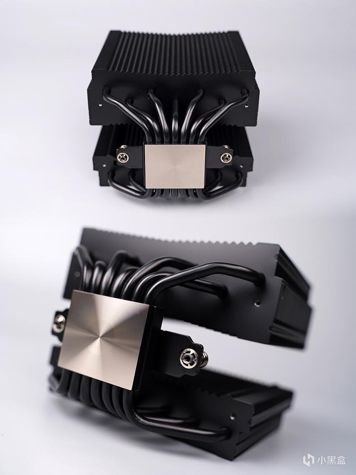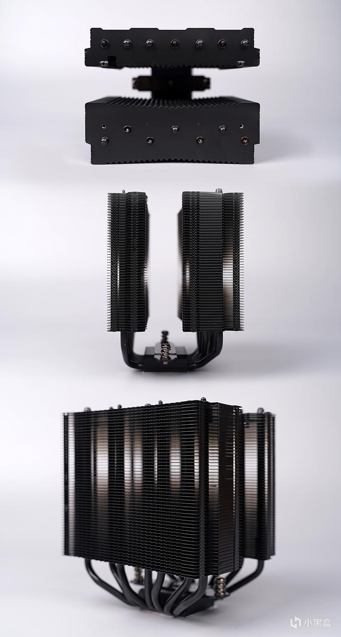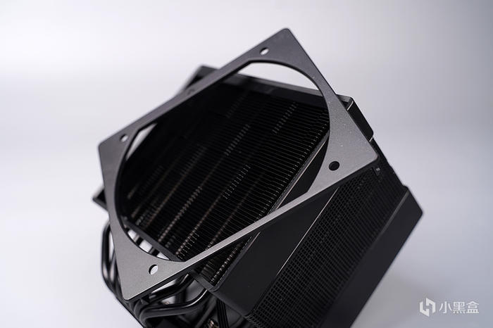 整個外套支持拆卸,便於後期散熱器的清灰,採用家族化的矩陣式鰭片組,官標有 106 片鋁製鰭片,具備有約爲 1139394mm² 的有效散熱面積,整體黑化塗層處理,穿 Fin + 折 Fin 工藝,加固保持鰭片之間的距離,鰭片之間十分的緊緻工整。