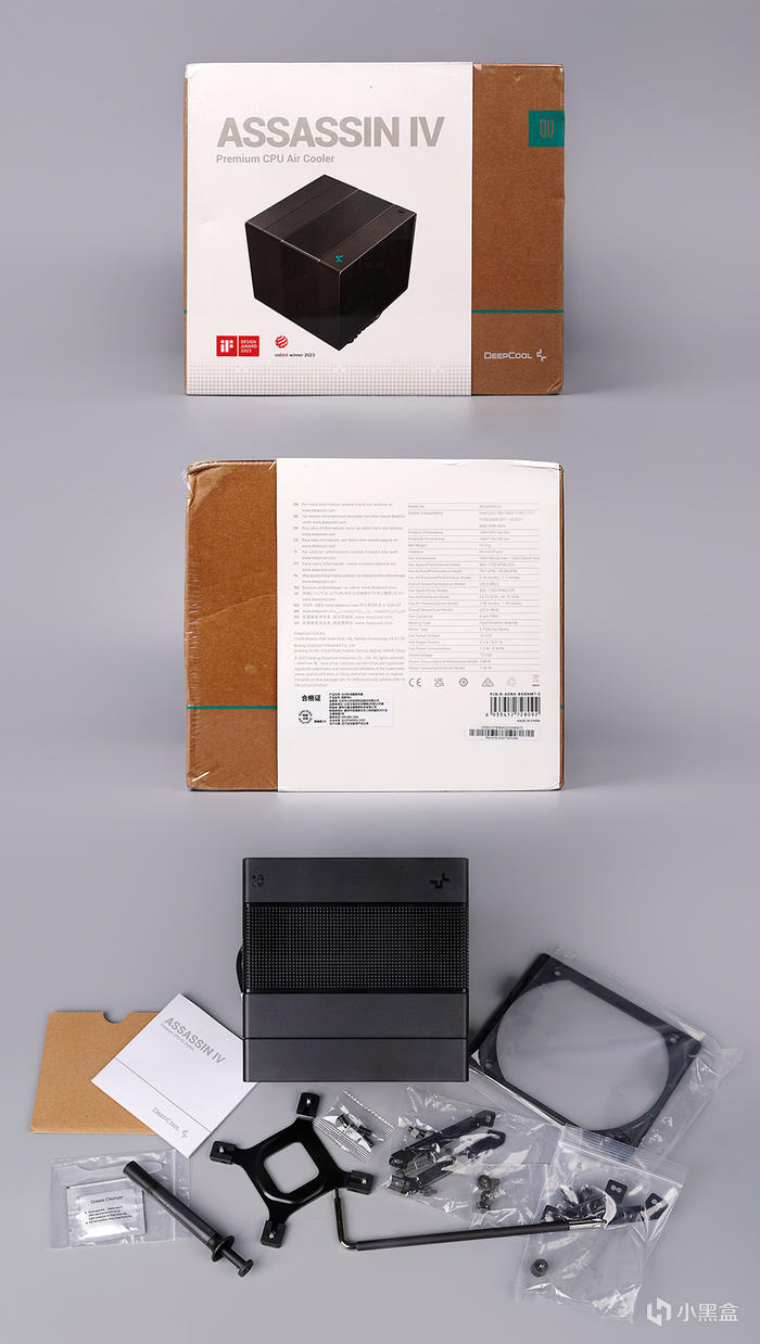 九州風神 DEEPCOOL 阿薩辛 4 旗艦風冷,延續品牌新一代簡約風格的包裝設計,抽拉形式,內牛皮紙外套白底產品外觀展示,標註型號 ASSASSIN IV,德國 IF 及 reddot winer 紅點 2023 設計獎,背部具體的規格參考,裏頭附件包含有說明書、散熱硅脂( 配有擦拭紙和刮刀 )、螺絲刀、風扇拓展支架及固定螺絲、扣具支持 AM4/5 及 INTEL 全家 。