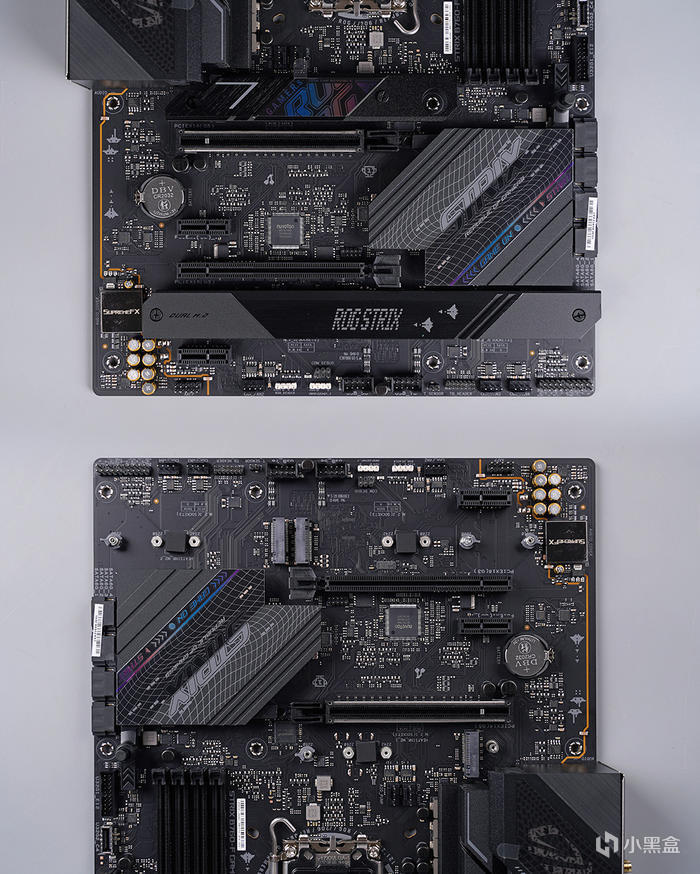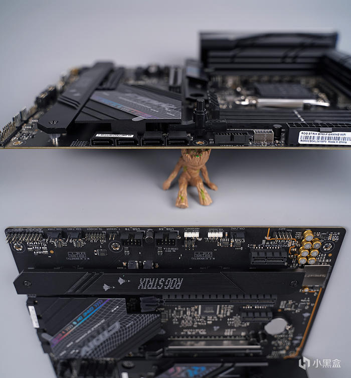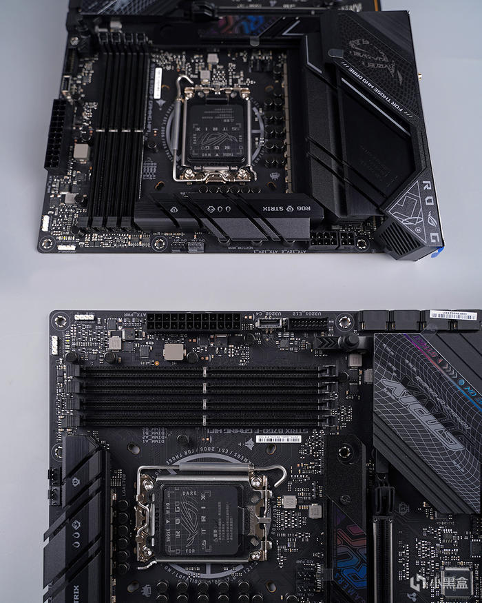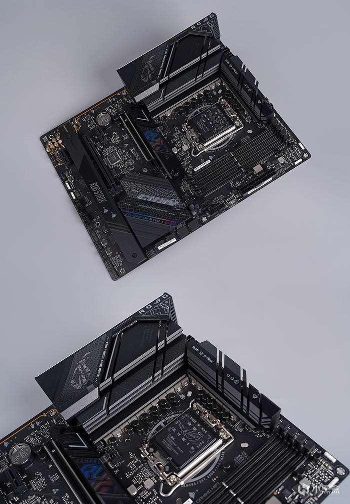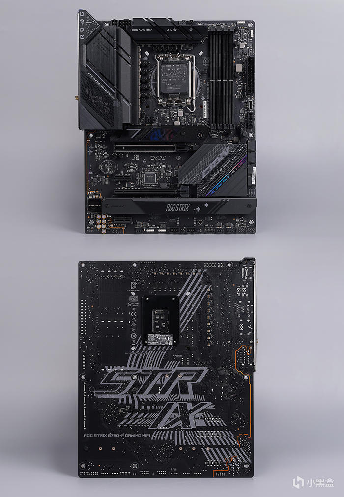 主板外觀,採用標準 ATX 版型規格,採用黑灰色外觀設計,大面積的散熱馬甲模塊覆蓋,表面敗家眼及相關文字標識圖案點綴,整體電競感滿滿,另主板背面還帶有 STRIX 圖案修飾。