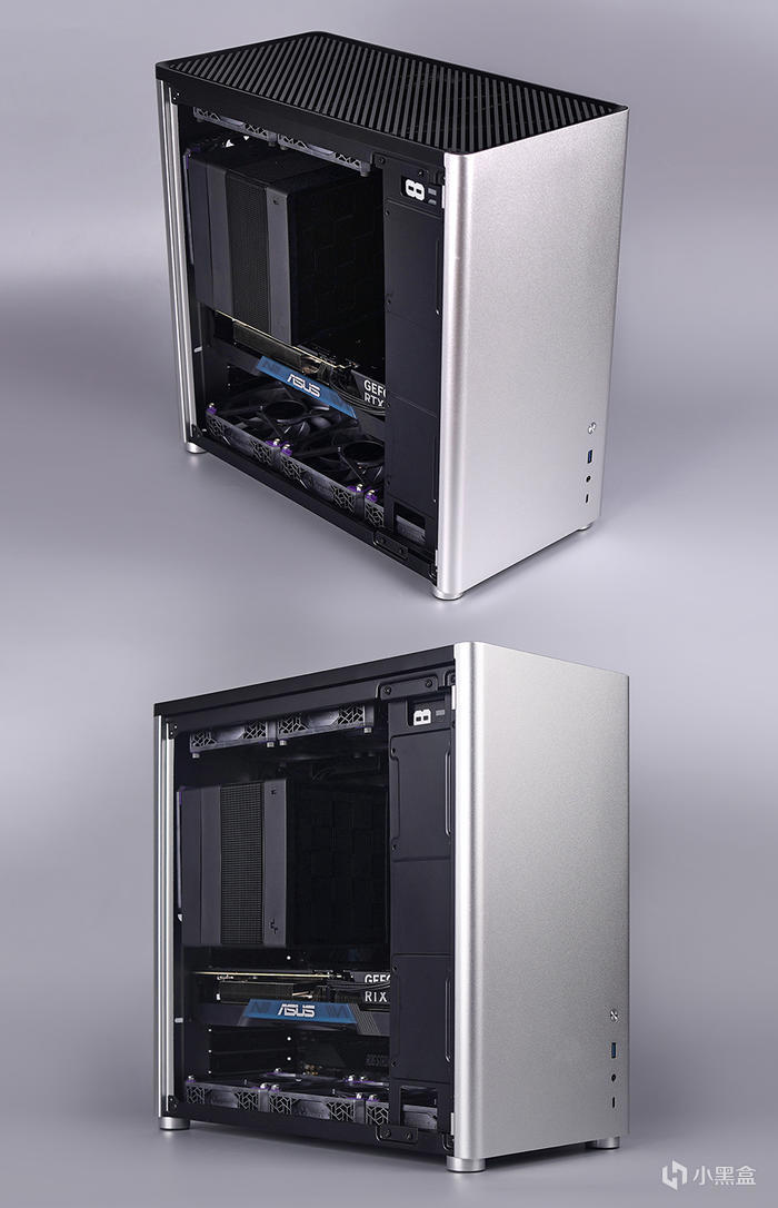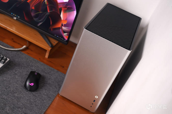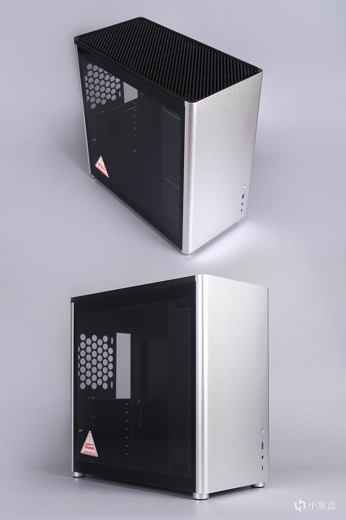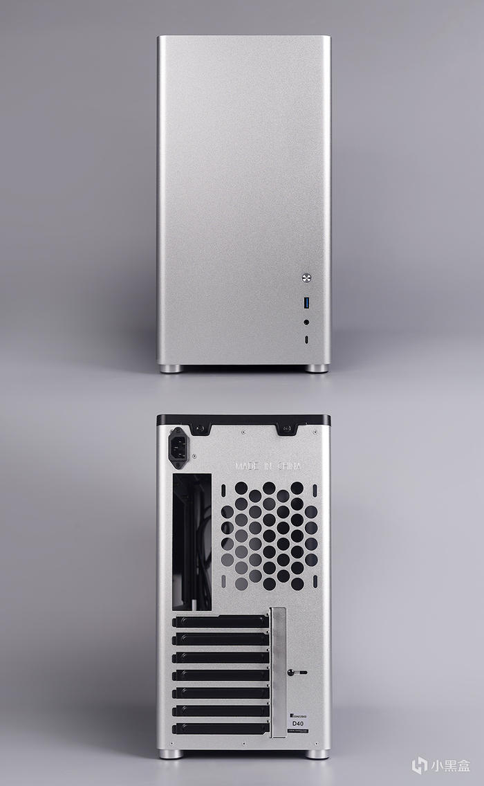 外觀採用極簡風格設計,前置沒有過多的元素,只有 I/O 模塊,給到有一個開機按鍵(光圈設計,帶有電源及硬盤指示燈功能)、一個 5GB USB 3.0 接口、 一個音頻輸出輸入、一個 5GB Type-C 接口。機箱尾部,上沿一個 120 風扇排風安裝位,邊上電源接口、7 個 PCI 安裝位。