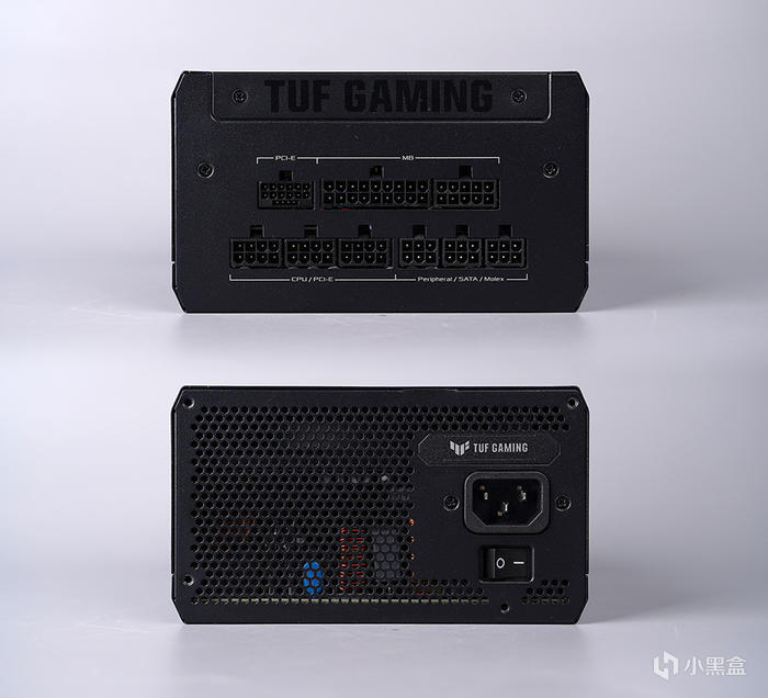模組接口部分,配有文字示意,給到一個原生 16PIN PCIE 供電接口、常規 PCIE 和 CPU 8PIN 供接口則爲通用設計 ( 合計 3 組 )、 3 組 6PIN PERIPHERAL/SATA/MOLEX 供電接口、主板 24PIN 合二爲一兩組;電源尾部,TUF 銘牌點綴,標準電飯鍋三插孔,搭配 AC 開關,一側大面積開孔出風設計。