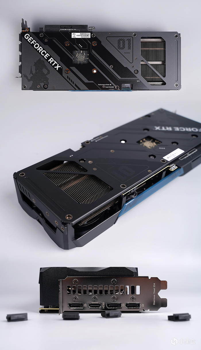 顯卡配備堅固的全金屬背板,表面相關元素圖案修飾,且金屬背板設計有進氣格柵,同軸流風扇協同工作,降低顯卡溫度,保證較低的噪聲水平。顯卡整體爲 2.7 槽厚度,PCI 擋板材質爲華碩顯卡喜聞樂見的 304 不鏽鋼( 抗衰老 ),輸出接口方面,提供了三個 DP1.4a 和一個 HDMI 2.1 接口。