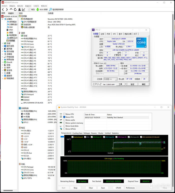 CPU 滿載溫度表現,AIDA64 單烤 FPU 壓力測試,20 分鐘左右,P-CORE 溫度最大值 81°C,E-CORE 溫度最大值 71°C,CPU 顯示功耗 180W 左右。