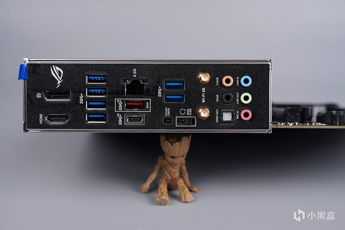 一體式 I/O 擋板,從左到右分別爲 HDMI 及 DP 視頻輸出接口、四個藍色 USB 3.2 GEN1 接口、兩個 10GB USB 3.2 GEN2 Type-A 和 Type-C 接口( 其中紅色 USB 兼具 BIOS 更新的數據輸入 )、2.5G LAN 接口、CMOS 復位按鈕、BIOS FLASHBACK 更新按鈕、兩個藍色 USB 3.2 GEN1 接口、Wi-Fi 6E 藍牙天線接口、音頻接口。
