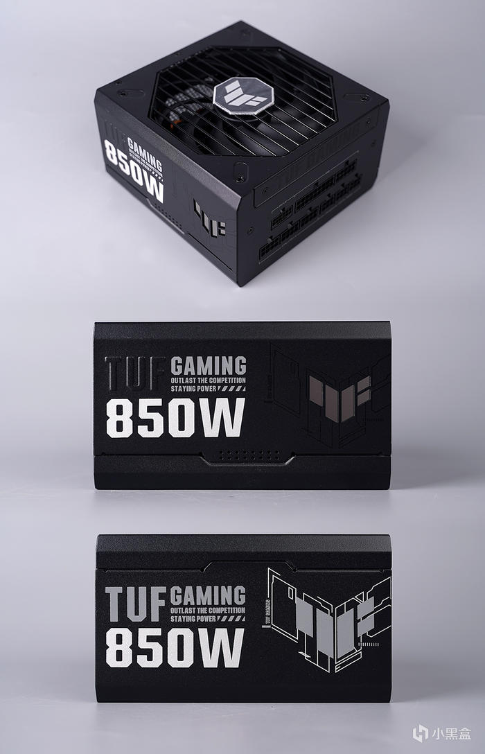 電源本體,採用標準 ATX 電源尺寸規格,具體 150×150×86mm ( L x W x H ),外觀有別於常規電源,TUF GAMING 上下左右兩邊做均倒角處理,有着非常不一樣的造型外觀,機身兩側,品牌元素修飾,凸面 TUF GAMING ... 組合型號文字,一側爲 TUF LOGO 光亮處理。