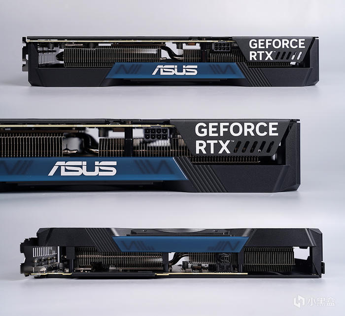 顯卡兩側採用大面積的外露式鰭片設計,增加進出風規模,加強散熱效能,鰭片做工非常的工整,居中冰藍色裝飾條,居中 ASUS LOGO 修飾,右上角 GEFORCE RTX 標註。