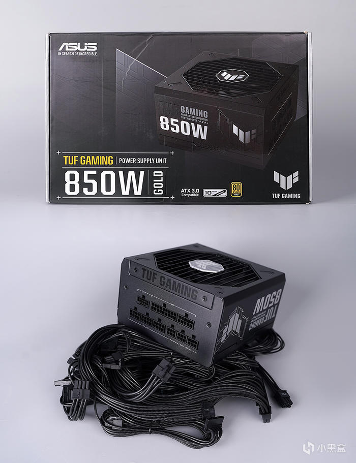 華碩 TUF GAMING ATX 3.0 850W 金牌全模組電源,包裝正面電源渲染圖示意,標註採用 ATX 3.0 設計、具備 10 年的質保時間 、80 PLUS 金牌認證等。電源搭配黑色壓紋包網模組線,質感相當的不錯,材質相比普通模組線也來得更軟一些,更好的走線,更加的美觀,基本可以省去後做定製線的錢了。