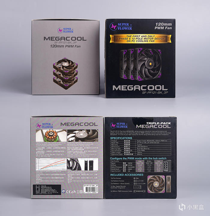振華作爲業界知名電源廠商,也跟風搞起了風扇,且還是定價頗高的性能扇。包裝正面帶有風扇本體展示,標註了其最大的特點的 12 級無刷直流電機三相設計。包裝的背面標註了其的各種特性,無刷直流馬達驅動 IC 採用 GMT 所設計,且採用了長壽麪的雙滾珠軸承,以及風扇的扇葉和外框均採用新型高分子材料 LCP 液晶聚合物。
