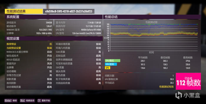 地平線 5 在 1080P 分辨率,極端特效下,開啓幀生成 DLSS3 測試平均 112FPS 。