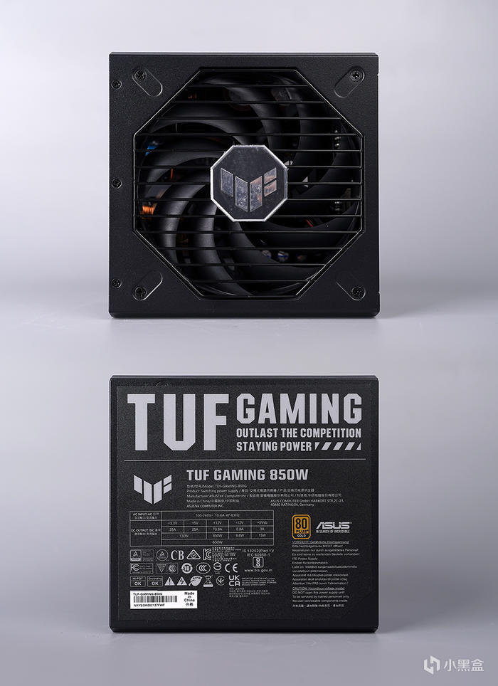 風扇位置,採用八邊形鏤空設計,對應形狀的鋼絲風扇罩及軸心 TUF 裝飾標誌,風扇採用 135mm 雙滾珠軸承的軸流風扇,有着更好的散熱及靜音表現,另值得一提的是內 PCB 採用保護性塗層設計,更具耐用性,不懼潮溼天氣,還有小強亂入,對應另外一面規格貼標,80PLUS 金牌認證,+5V 和 +3.3V 輸出電流 25A,合計輸出 130W,+12V 輸出電流 70.8A,提供最大 850W 的功率,其它方面,帶有 OPP/OVP/UVP/SCP/OCP/OTP 保護功能,採用低 ESR 日系電容可提升效率並減少發熱源,降低噪音以及提高可靠性與穩定性,另獲得了 iST 宜特檢測實驗室多項測試認證。