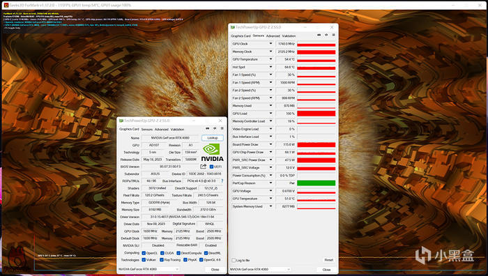 FURMARK 滿載測試,過程 20 分鐘左右,華碩 ATS 巨齒鯊 GEFORCE RTX 4060 O8G GAMING,GPU 頻率 1800MHz 上下,顯存 2125MHz 上下,核心溫度 54.4°C(結溫 64.6°C),顯示功耗 115W 左右。