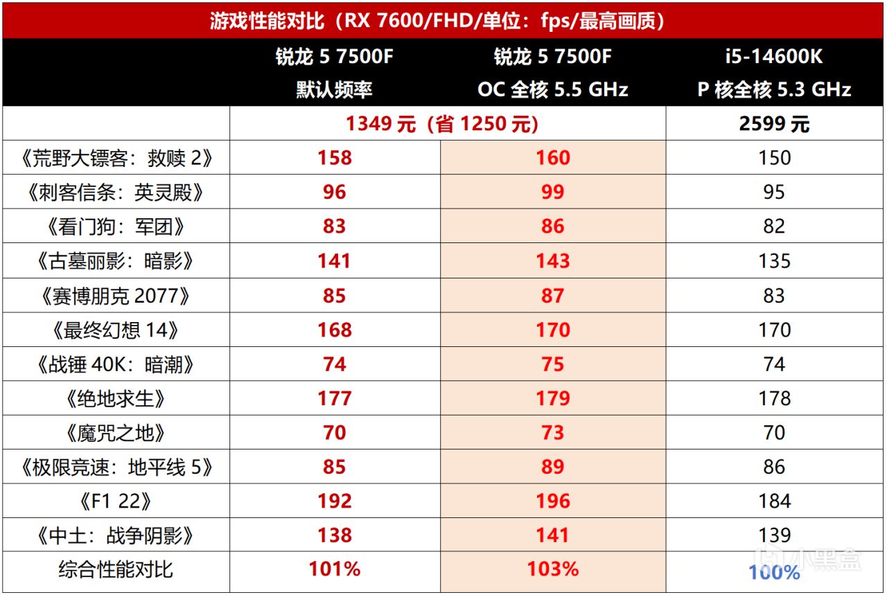 从实际游戏表现可以看到,锐龙5 7500F在游戏中的表现也能和i5-14600K打得有来有回,还平均领先1%。要是将锐龙5 7500F的频率提升到全核5.5GHz,在此频率下,该处理器在所有游戏中的成绩均实现了领先,综合领先幅度为3%。