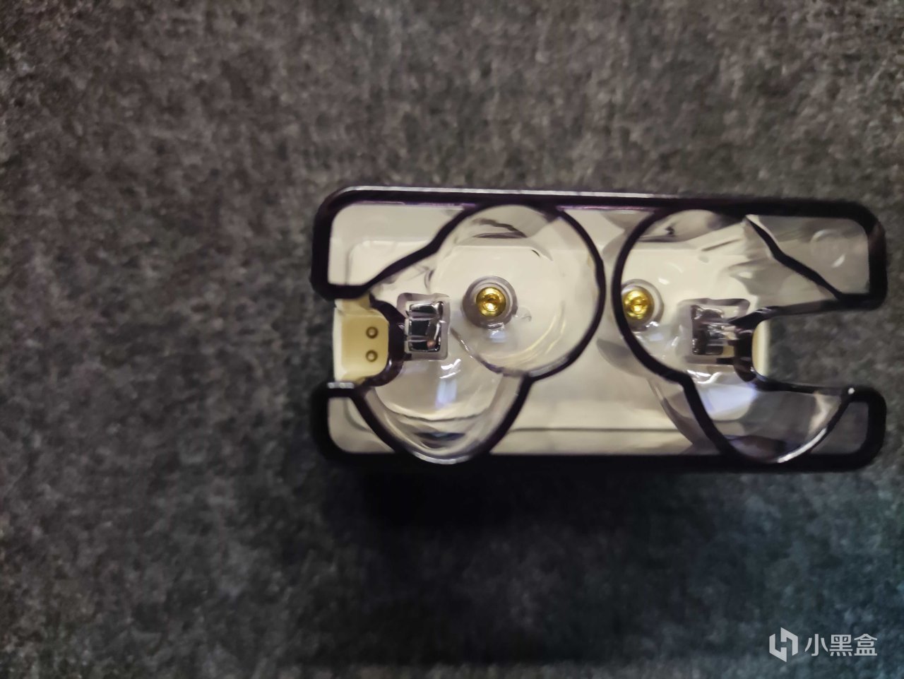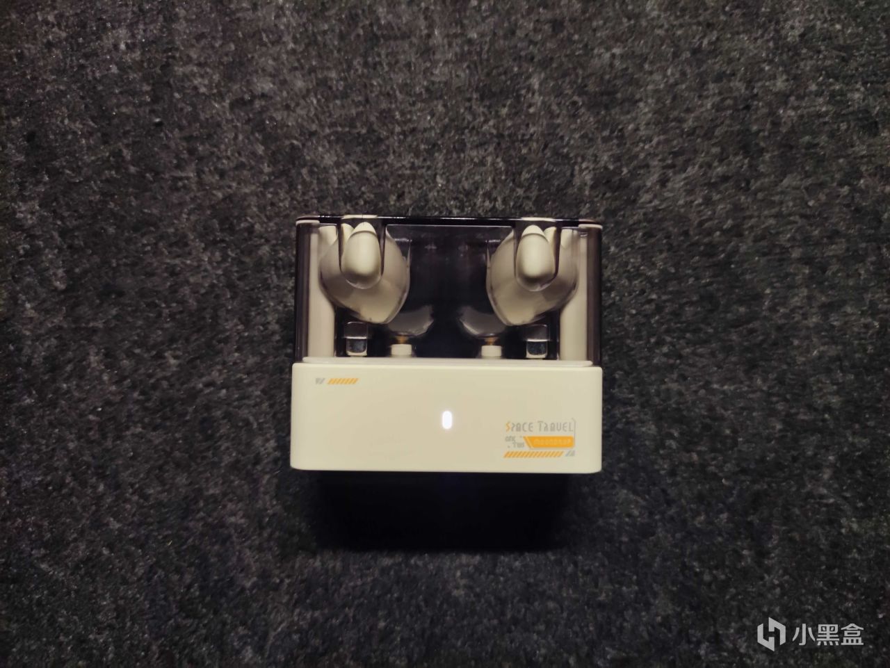 耳机上半部分是一个透明的壳体,下半部分则是一个纯色搭配上一些简单的字体和图标的设计。这个上半部分和下半部分不能分开的哈。