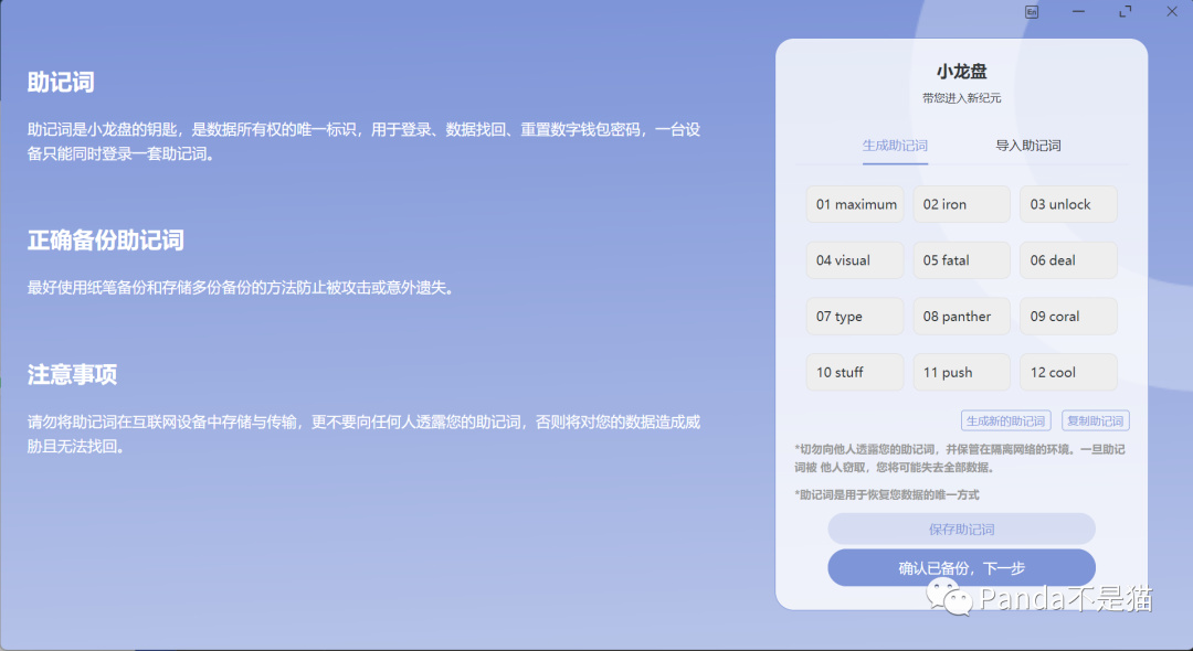 按照它的指示我们安装好,这里提示需要我们助记词,而助记词也是唯一识别验证的东西,而一台设备只能同时拥有一组助记词,忘记了就无法打开了。可以的,这很安全。