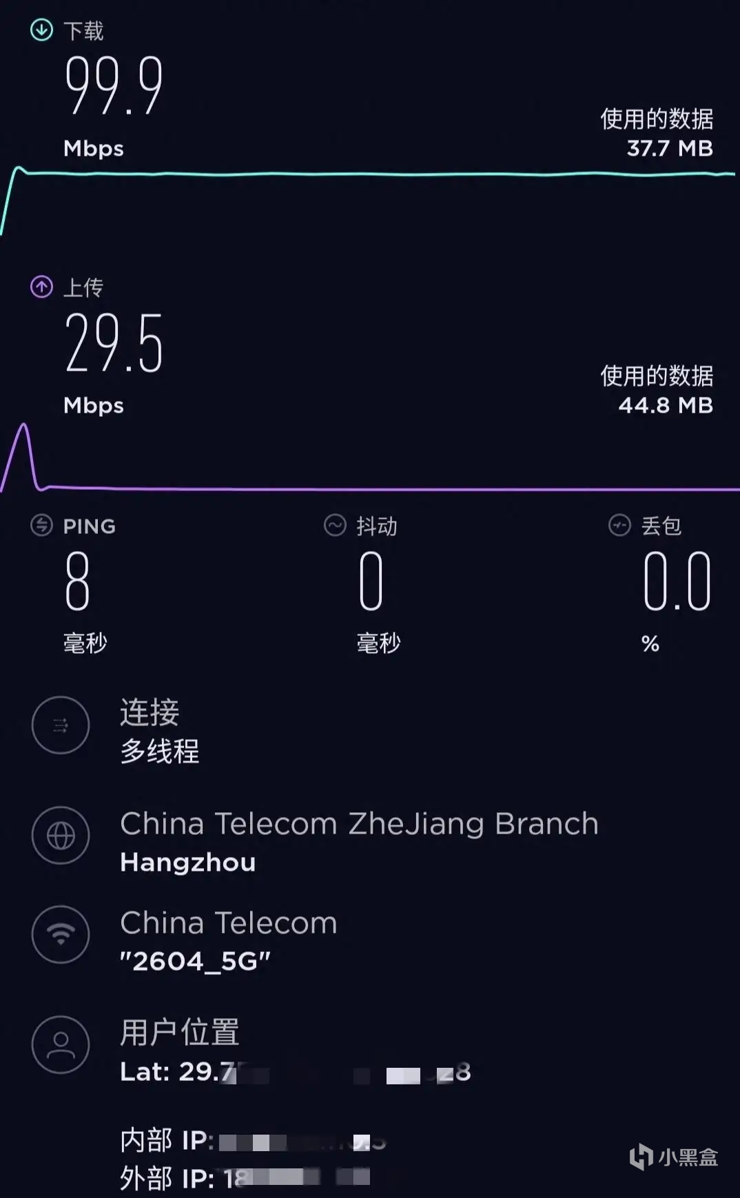 现在路由器放在客厅配电箱里,带宽速度为百兆,房间为三室一厅的布局,在书房、客厅、主卧区域,基本上5G信号都是满格,信号强度不错。现在看视频或者游戏时,没有出现卡顿及延迟的情况,常用的电视投屏现在响应也更快了,软件测试了一下网速,这个下载速度为99.9兆,上传速度为29.5兆,应该是把这个百兆带宽的潜力挖掘出来了。