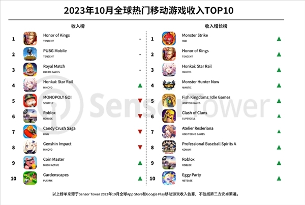 日前,该公司公布了2023年11月份的全球热门移动游戏收入top10排行榜(不包括安卓渠道)