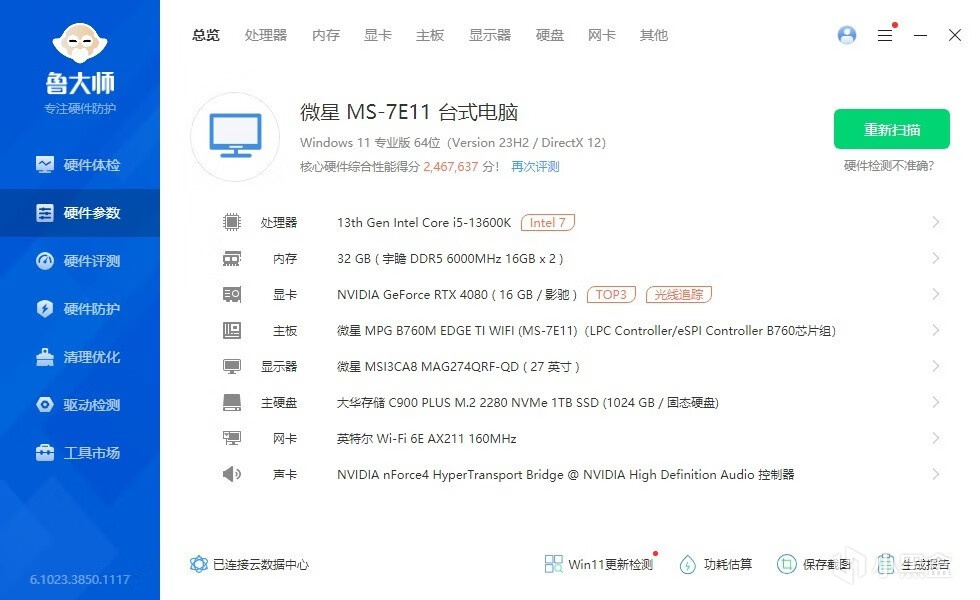 ▼整機配置一覽,處理器是13600K,主板是微星的B760M刀鋒Ti,顯卡是影馳的RTX4080星耀OC,整機配置很強。