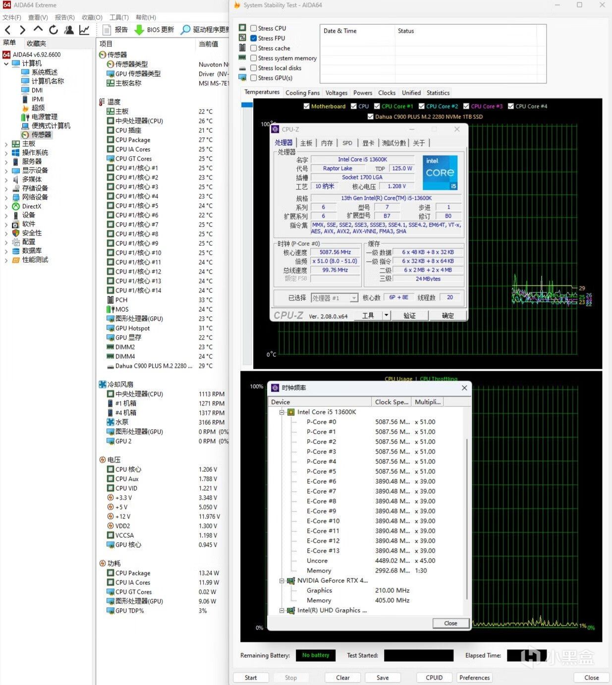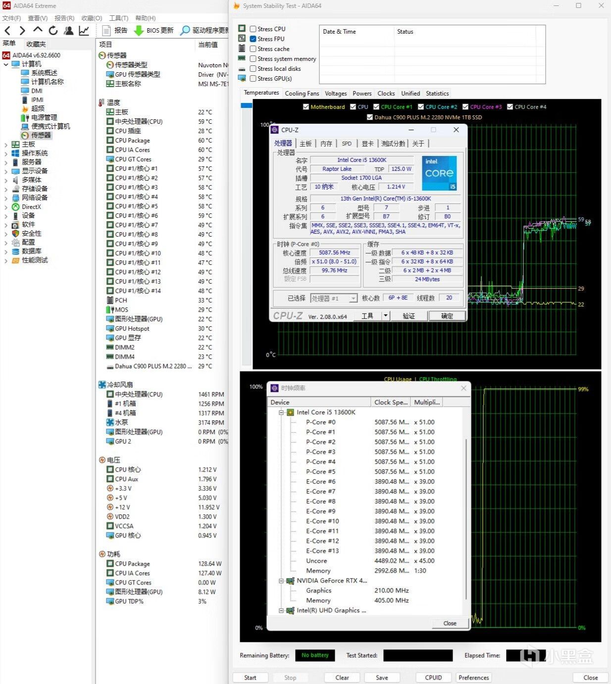 ▼簡單跑個CPU-Z的壓力測試,處理器功耗在130W左右,大核心睿頻5.1GHz、小核心睿頻3.9GHz,溫度在59℃,南橋溫度33℃,供電溫度29℃,顯卡核心22℃,固態29℃。