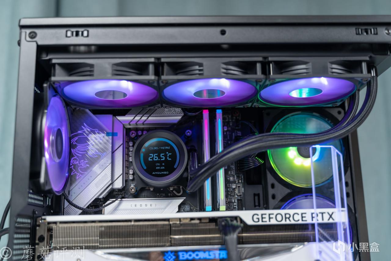 ▼機箱內部的各種燈效都隱約被壓暗了,但依然可以輕鬆看到機箱內部的各種硬件。