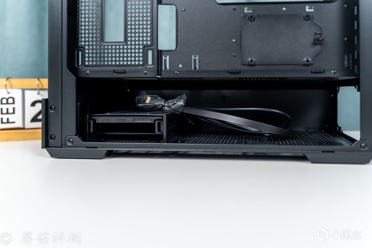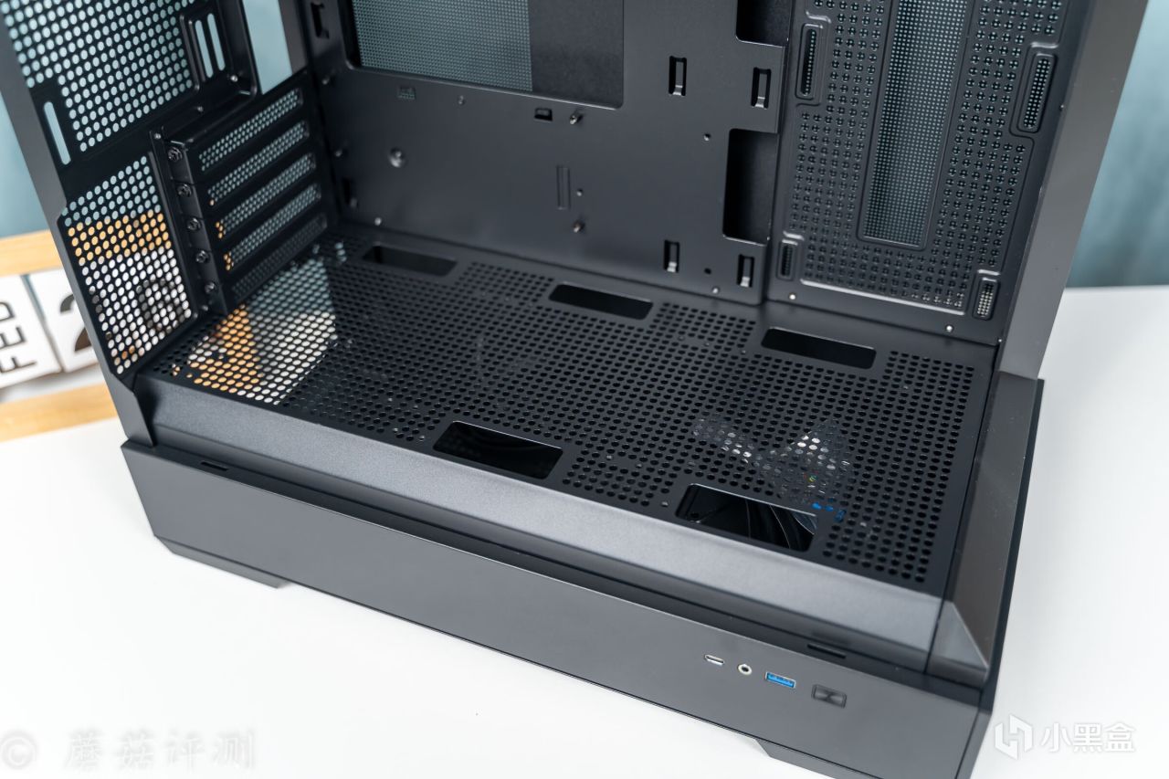 ▼機箱底部,是熟悉的下至電源倉,電源倉的頂部有祕籍的金屬衝孔網設計,並配有螺孔,方便安裝機箱風扇。另外,在合適的位置還有走線開口,方便走線。