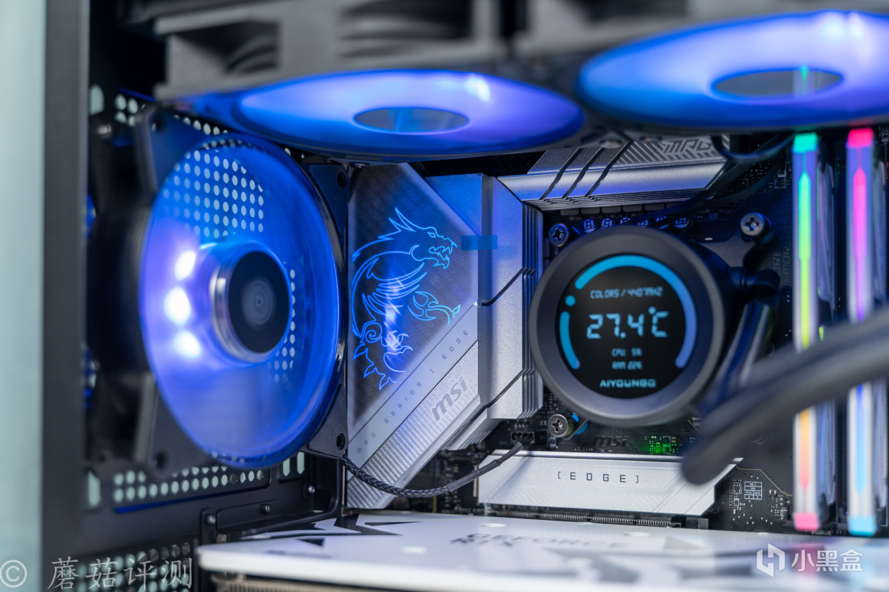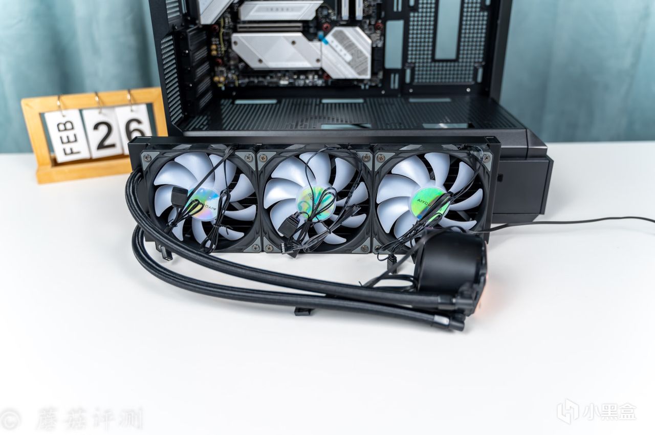 ▼水冷整體是黑色的,質感很不錯。水冷排風扇的扇葉是乳白色的,支持ARGB燈效,支持主板同步,整體效果不錯。
