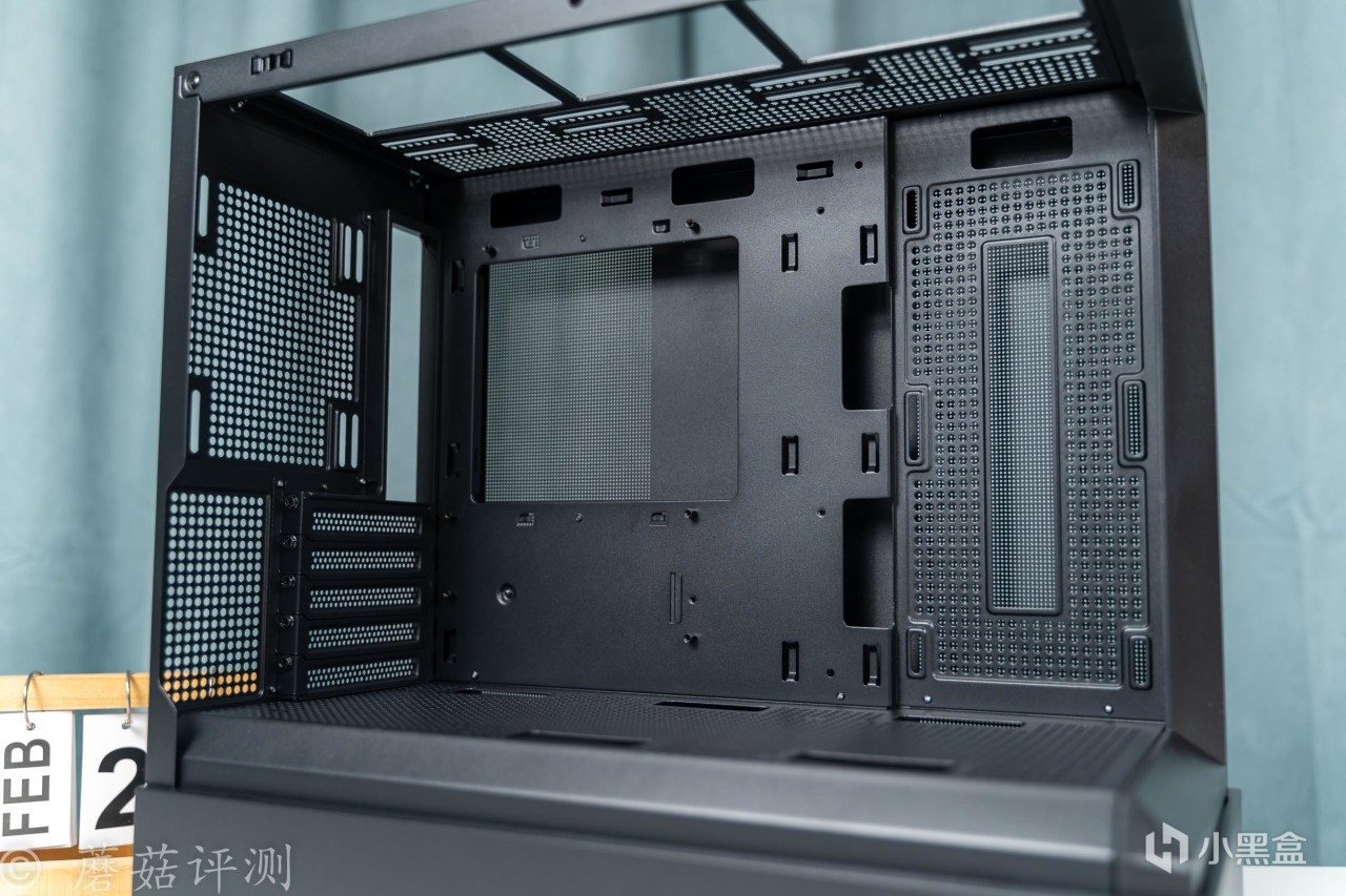 ▼機箱尾部,熟悉的mATX規格機箱的配置,底部有5條PCIe金屬擋板。主板後部IO擋板開口的右側是後置機箱風扇位,頂部有加高設計,方便在機箱頂部安裝固定水冷排。