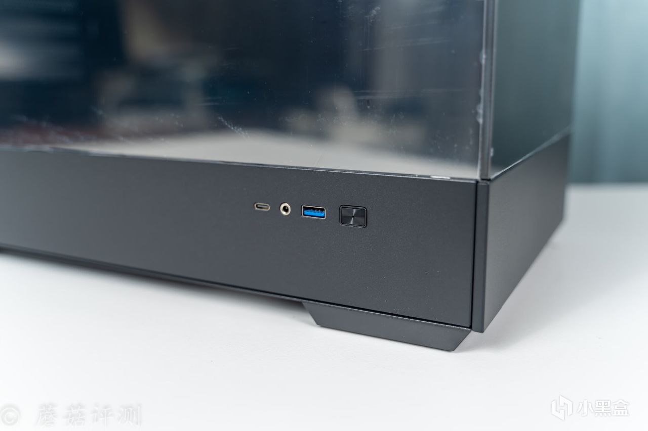 ▼機箱側面的底部,是機箱的IO面板,除了開機鍵之外,還有一個Type-C接口、一個3.5mm的音頻接口和一個USB 3.0接口。