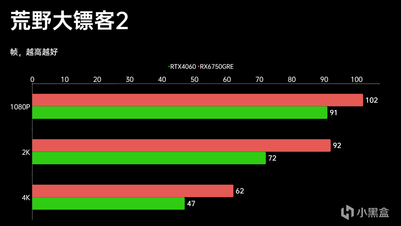 依旧是RX6750GRE占优,4K分辨率下依旧能畅玩,而RTX4060在4K分辨率下到不了60帧,同样地这两张卡在2K分辨下差距比较大。