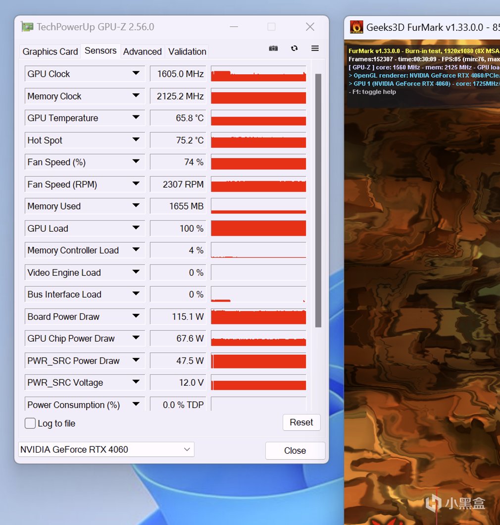 满载1605MHz核心频率,温度65.8℃,功耗115W,风扇2307转;