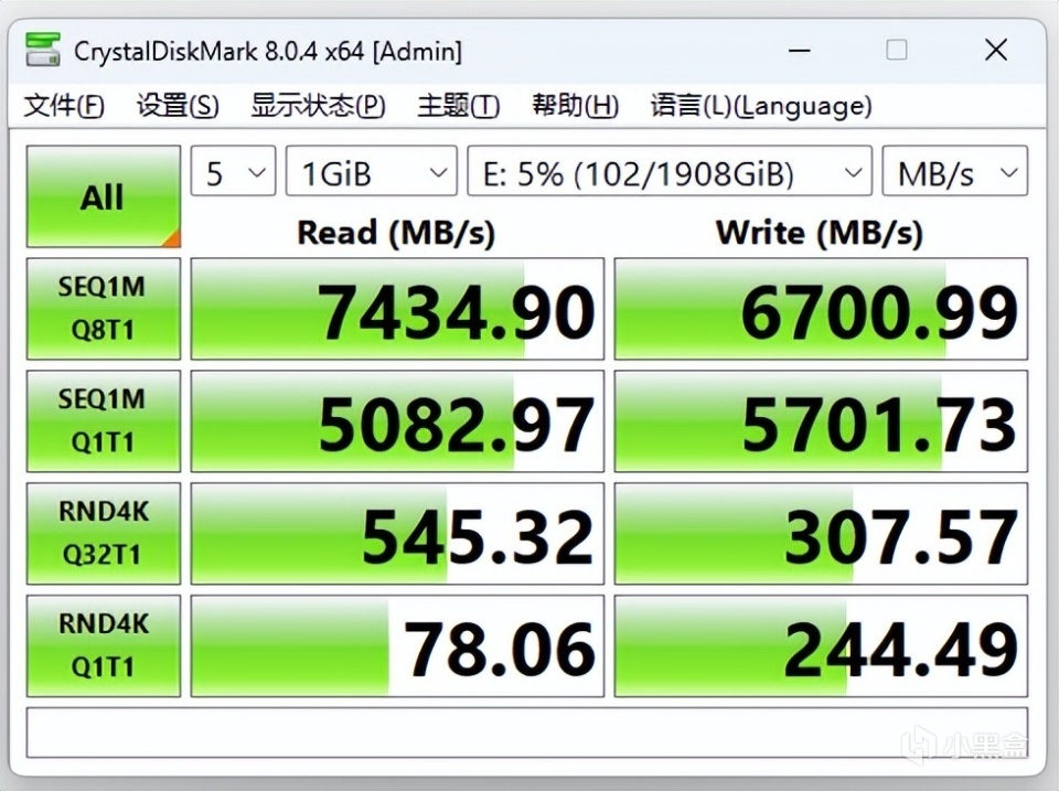 硬盘方面,实测aigo P7000Z,该固态为PCIe4.0固态,经过AS SSD与CrystalDiskMark实测,速度表现都可圈可点,都达到了PCIe4.0固态的带宽的上限。