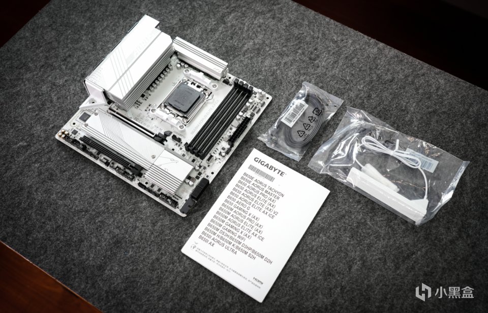 技嘉B650M冰雕主板的开箱比较简单,除了主板就是SATA线、白色的磁吸鲨鱼鳍WIFI天线以及产品说明书。