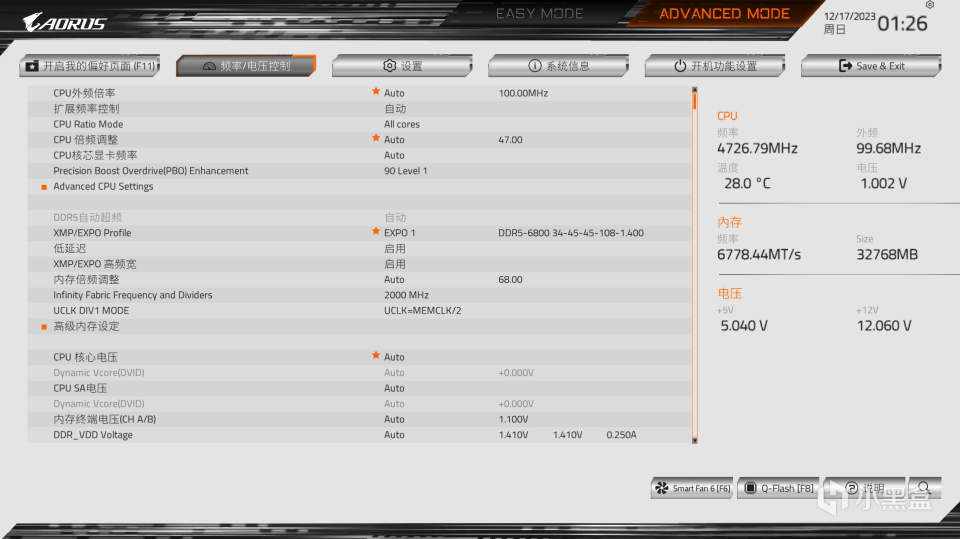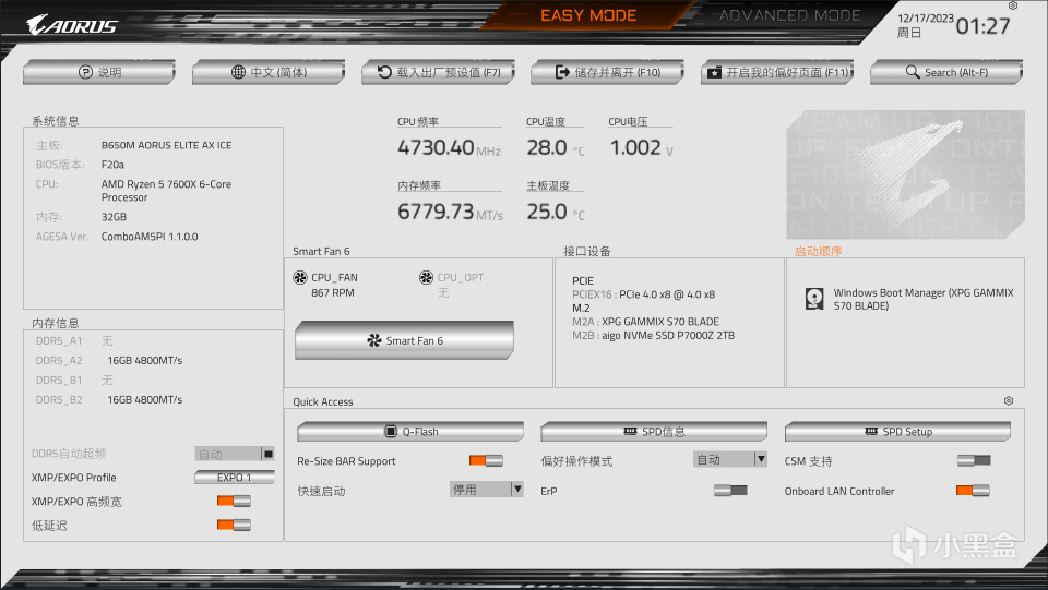 这里也多说下技嘉B650M冰雕的BIOS,整个界面UI设计也非常契合其命名,很多常用的功能项目都在首页,比如PBO、电压等设置,都可以更快速的帮助用户调整参数 。