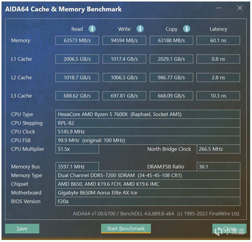 进一步将内存进行超频。实测在7200MHz的频率下,内存的读取速度达到了63573MB/s,写入速度达到了94594MB/s,复制速度达到了63188MB/s,延迟为60.1ns。
