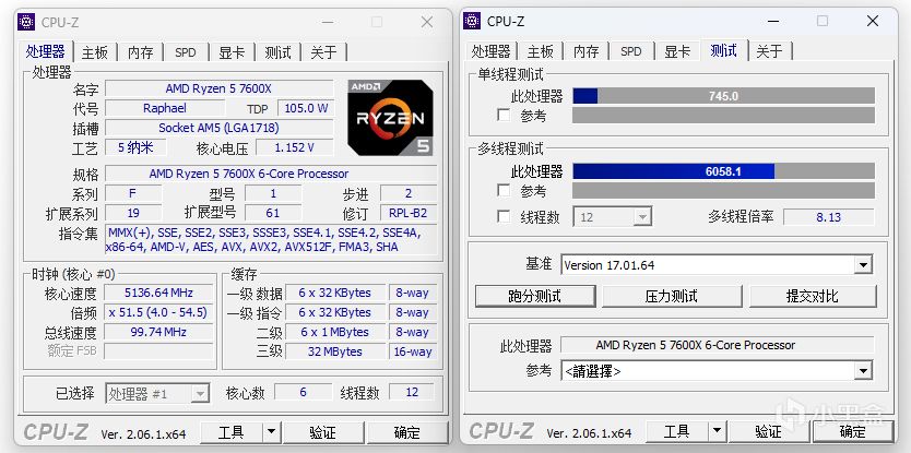 先看看CPU-Z方面,在默认设置下,R5 7600X多核6058.1分,单核745分。