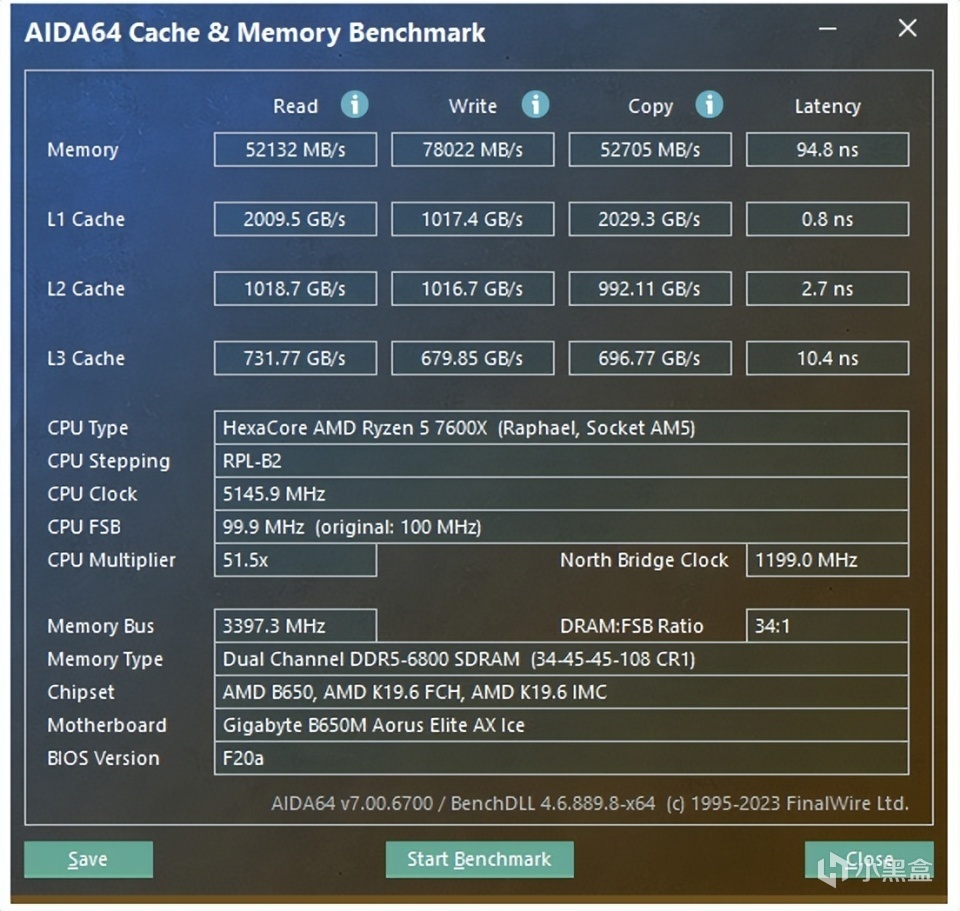 开启EXPO后,内存的频率达到了6800MHz(时序34-45-45-108),但是在关闭High Bandwidth(高带宽)与Low Latency(低延迟)的条件下,内存下性能增加并不明显,实测下来读取速度为52132MB/s,写入速度为78022MB/s,复制速度为52705MB/s,延迟为94.8ns。鲁大师内存得分表现也与默认频率下没有太大出入。