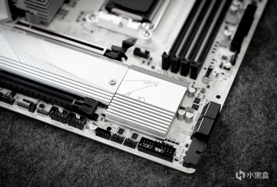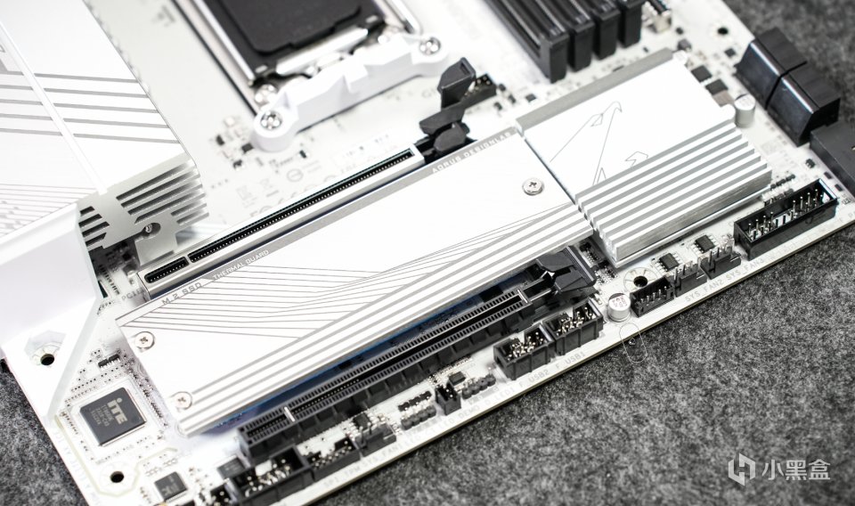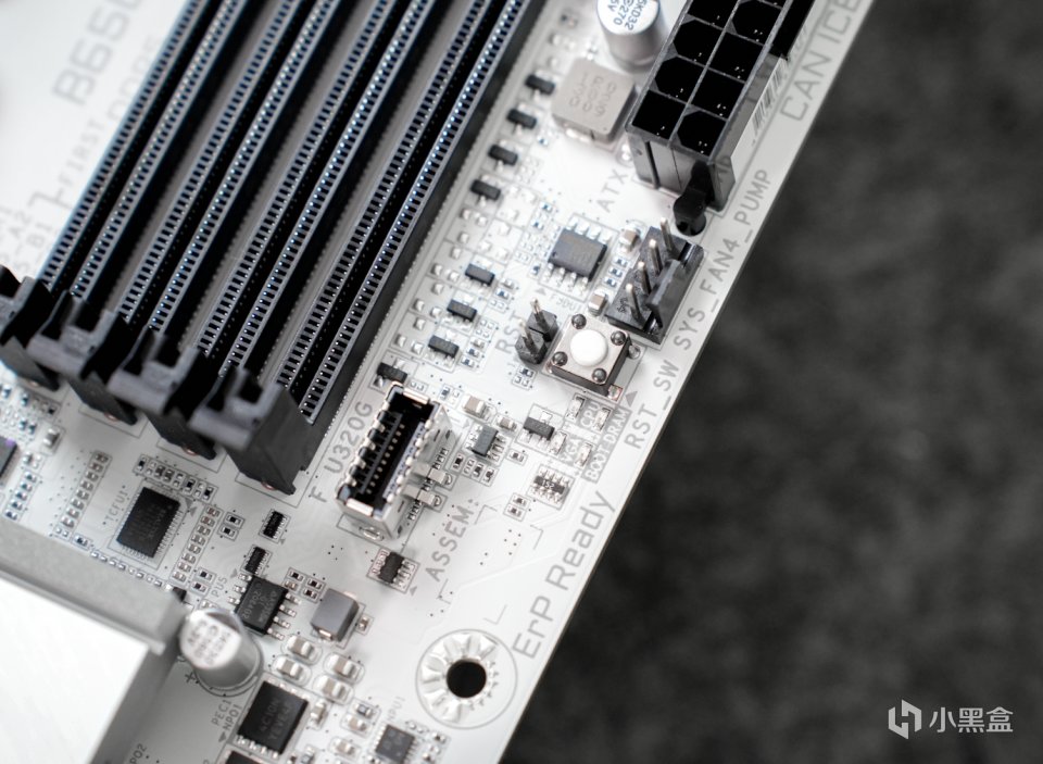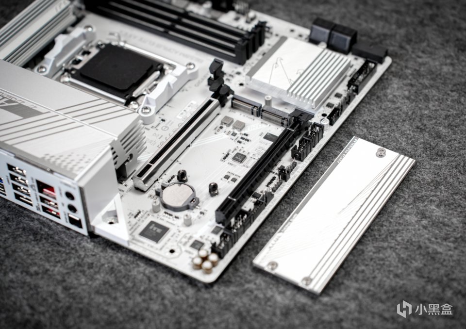 要说技嘉B650M冰雕主板的独到之处,首先就要从极为醒目的颜色说起。顾名思义,冰雕就是要白色,为此整块主板包括PCB绝大多数地方都为白色。除了内存、电源、硬盘、显卡等接口才是黑色。所以这块显卡的辨识度极高,极为适合打造纯白全家桶。